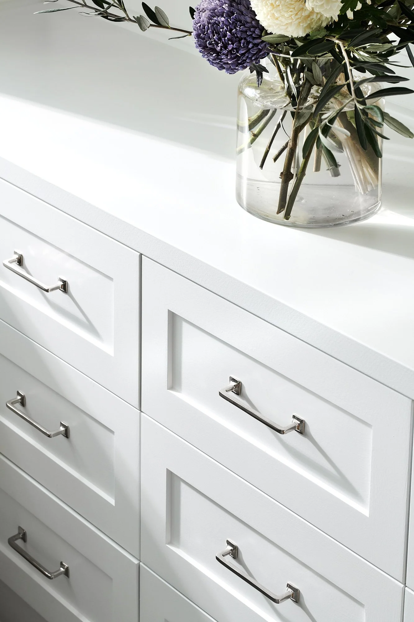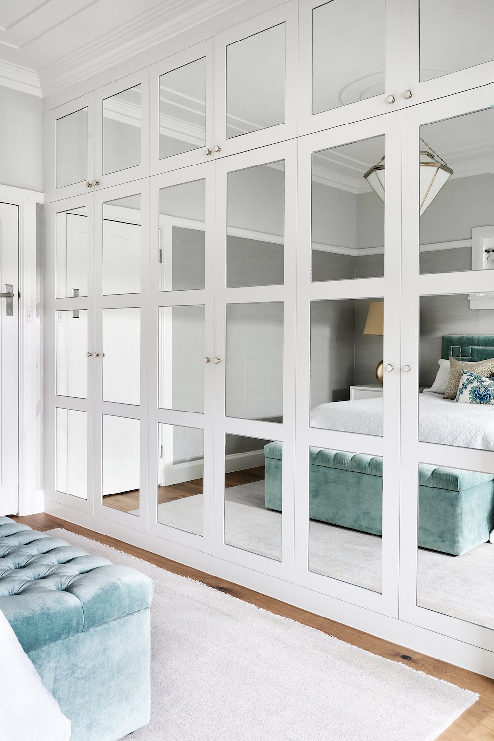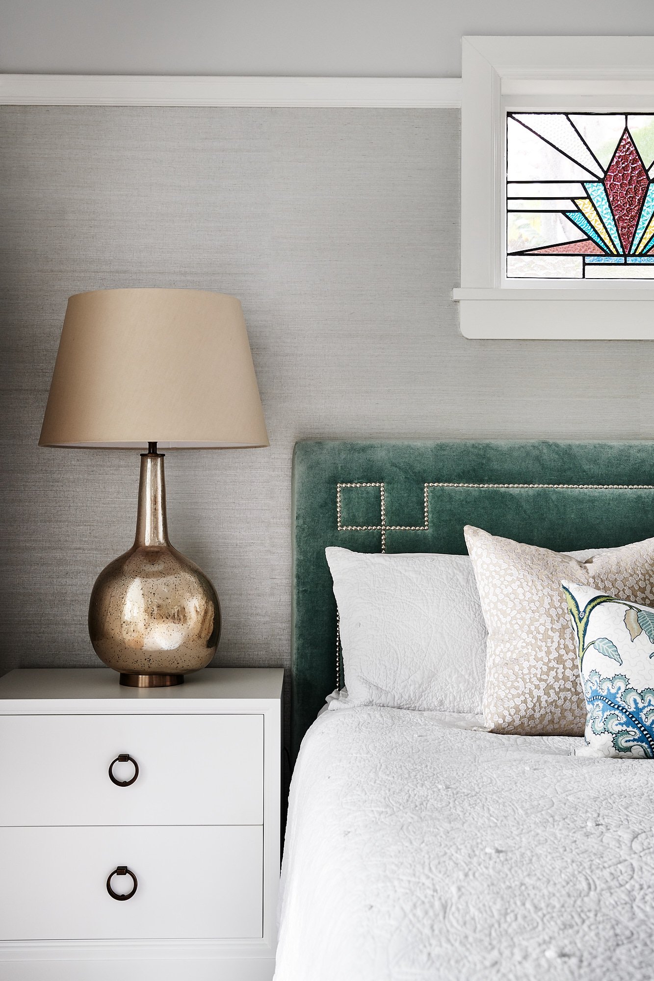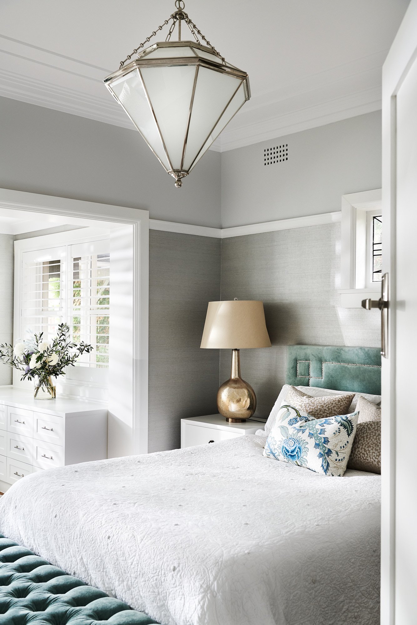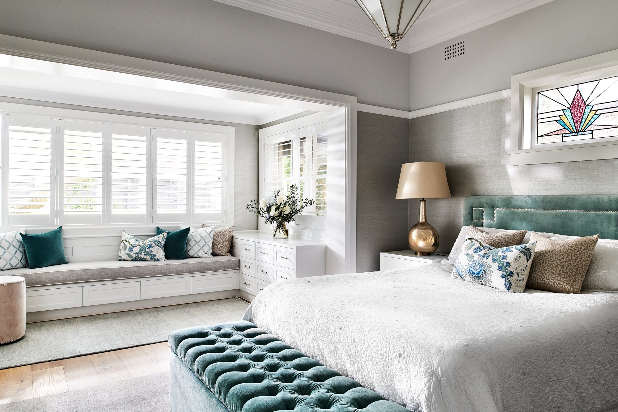 An elegant background palette of oak flooring, white mirrored cabinetry and nickel hardware set the tone for this beautiful master bedroom renovation. Originally a spare room used as a family dumping ground, we transformed the space into a light-filled retreat, complete with custom designed cabinetry to suit our client’s needs. Drawing inspiration from the stunning art-deco period features, we created a calm and tempered space filled with soft, luxurious textures in soothing tones.